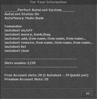 !autoloot - Exibe todos os comandos ingame! !autoloot add, NomeDoItem ( Exemplo: !autoloot add, golden legs ) - Adiciona um item ao Autoloot!